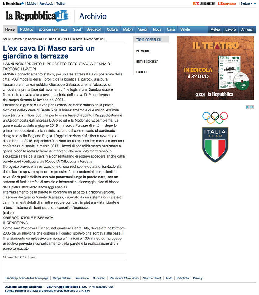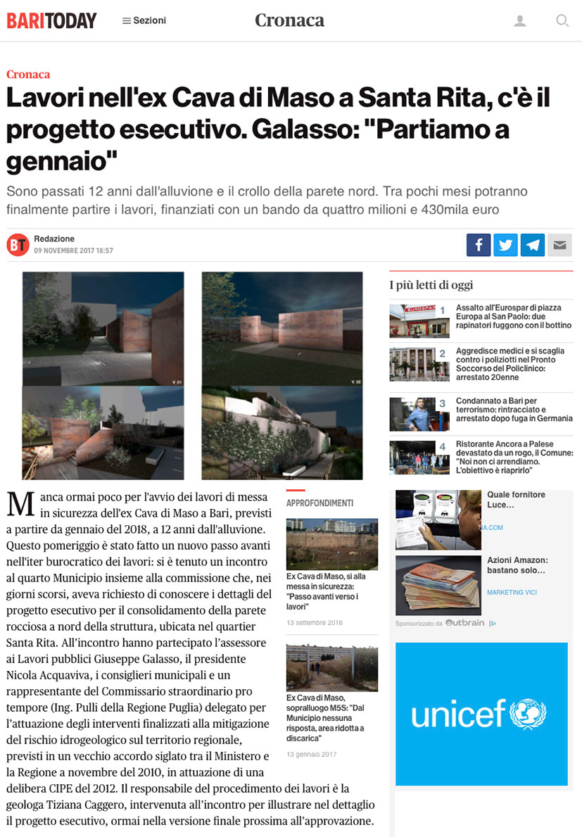 The project concerns the consolidation of the northern rock face of the former Cava di Maso located in the Santa Rita - Carbonara 2 district of the municipality of Bari. The project, drawn up in A.T.P. with the Romanazzi Boscia studio a Associati S.r.l. of Bari, was the winner in a public tender and is currently being implemented.