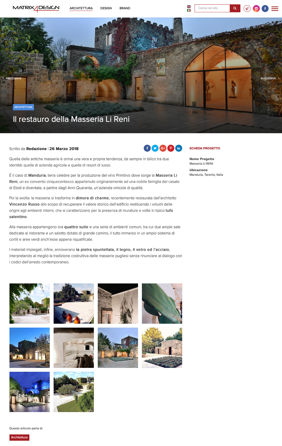 The recent restorations, carried out with the aim of recovering the value of the farm and in respect of its historical value, have given back to the original volumes of the interior environments characterized by walls and vaults made of Salento tuff. The materials used (spiked stone, wood, glass and steel) speak the language of the construction tradition of the Apulian farms and seek a contrasting and fertile dialogue with the contemporary lexicon of the furnishings and finishes in resin.