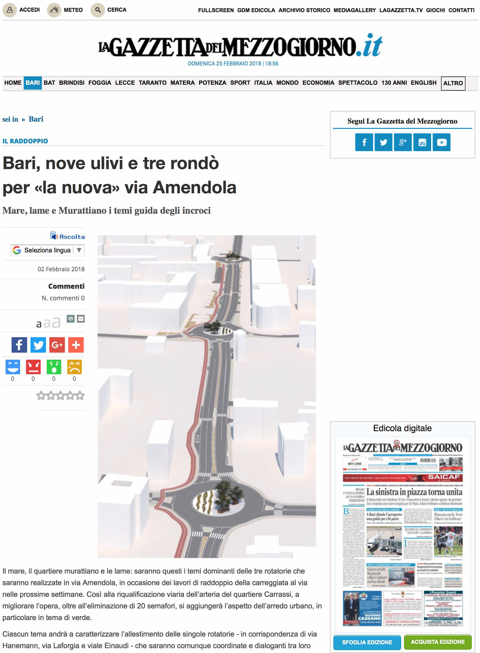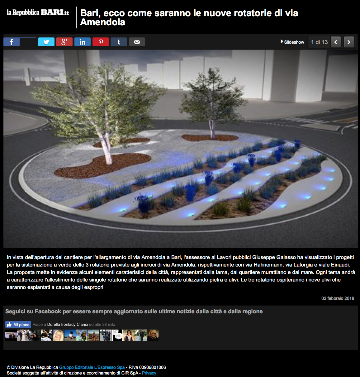 The green layout project of three roundabouts along Via Amendola, one of the main axes of access to the Apulian capital, is drawn up as part of the proposed technical improvement proposal on the executive project based on the tender by the Municipality of Bari. The project proposal , processed in ATP with the Romanazzi Boscia studio a Associati S.r.l. di Bari, was the winner of 23 projects in the competition and is currently being implemented.